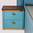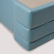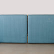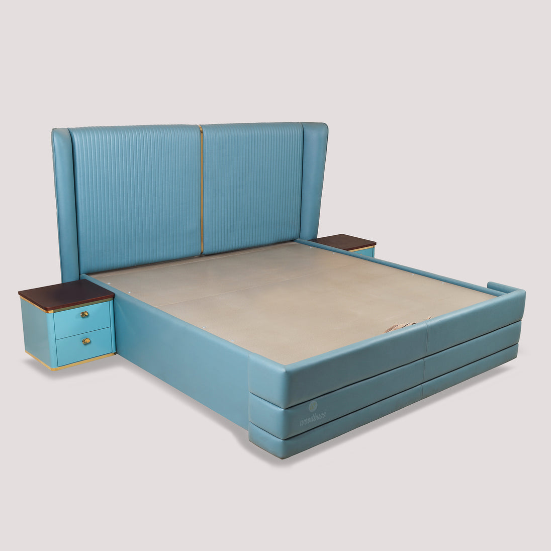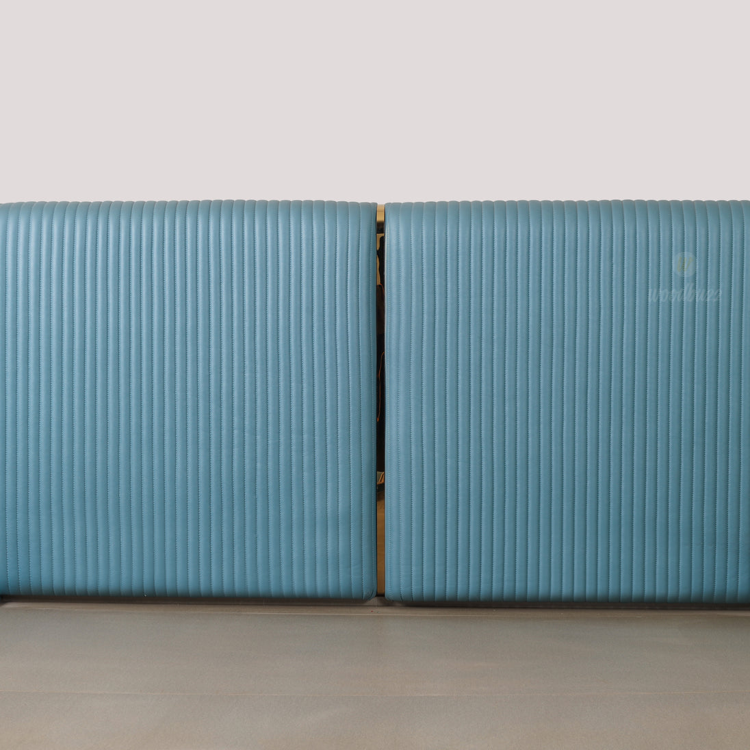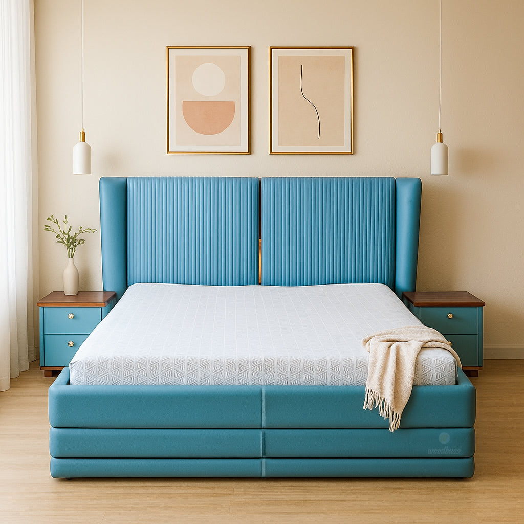 - Elegant modern bed with a bold turquoise upholstered frame and ribbed headboard design.