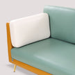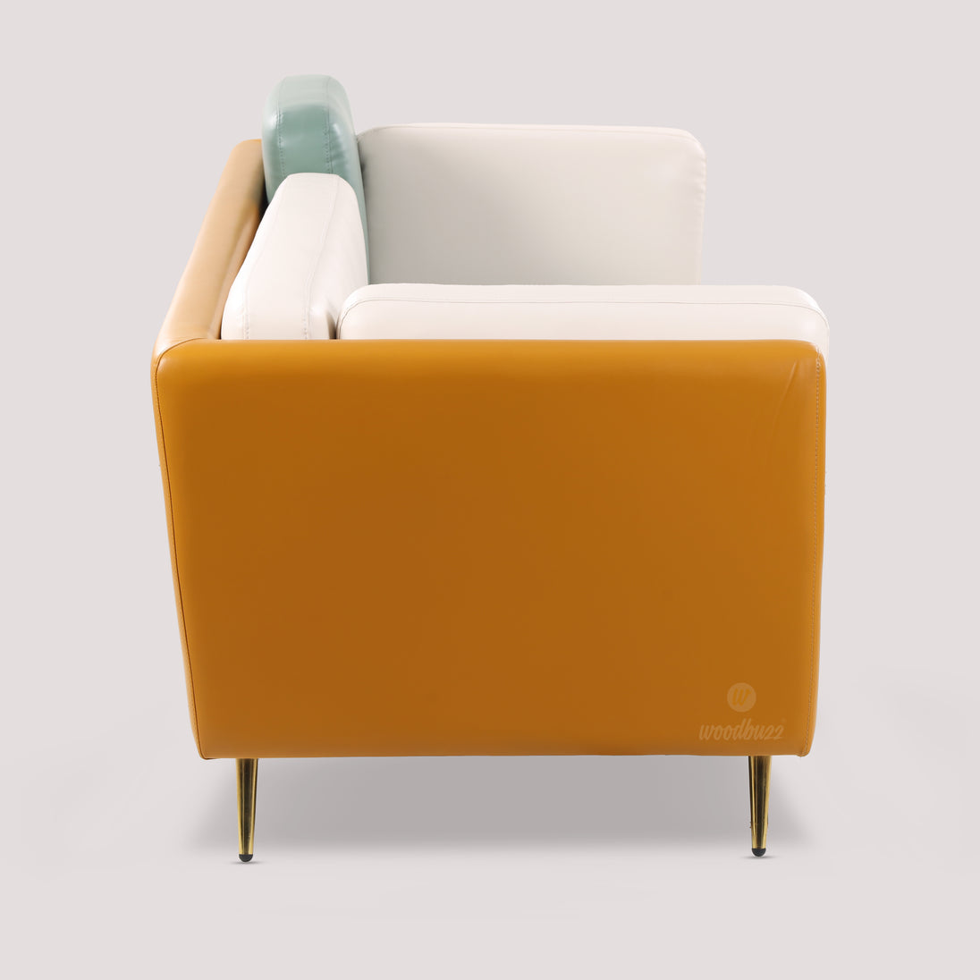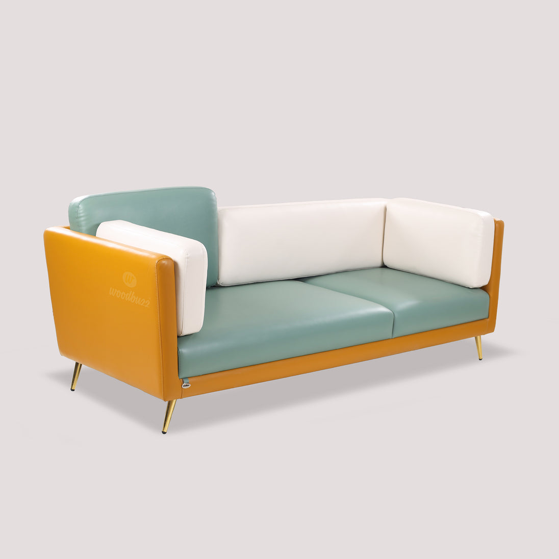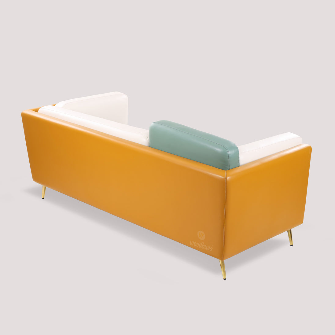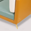 - Bold tri-color 2-seater sofa featuring a vibrant mustard yellow frame with sage green and cream upholstery for a playful retro aesthetic.