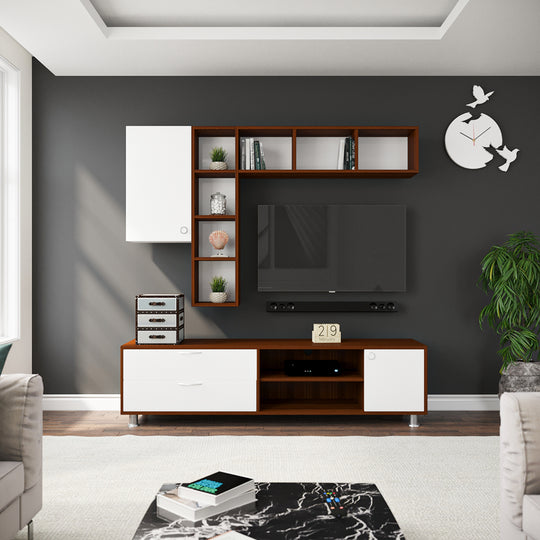 - Two shelves and a cabinet on either end hold your AV equipment, while the spacious drawer can accommodate DVDs and other odds and ends.