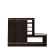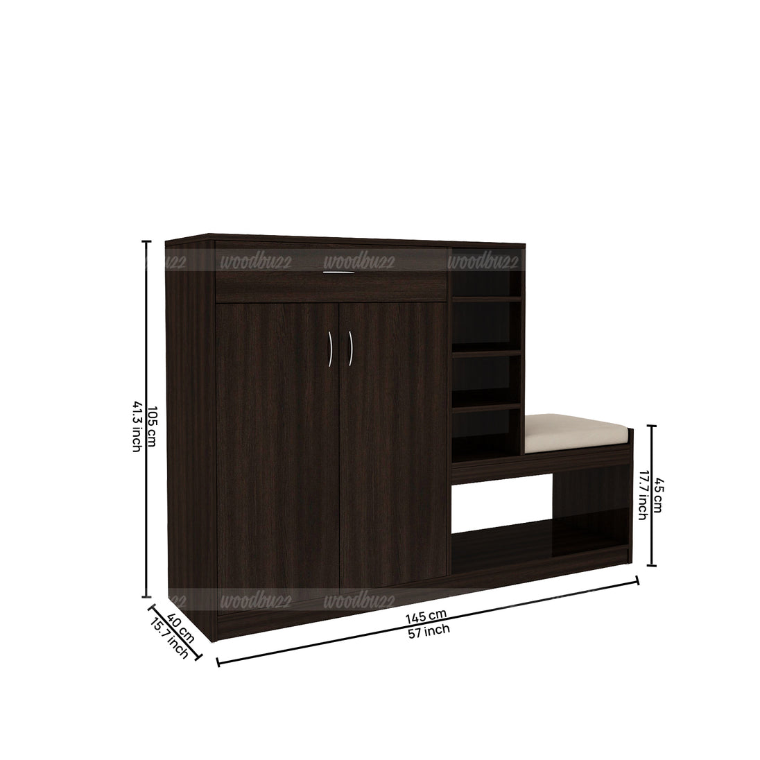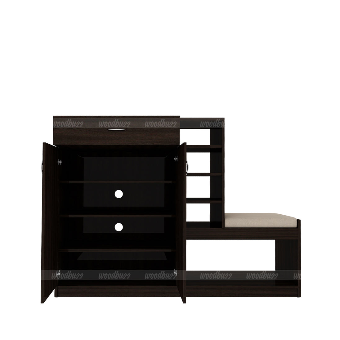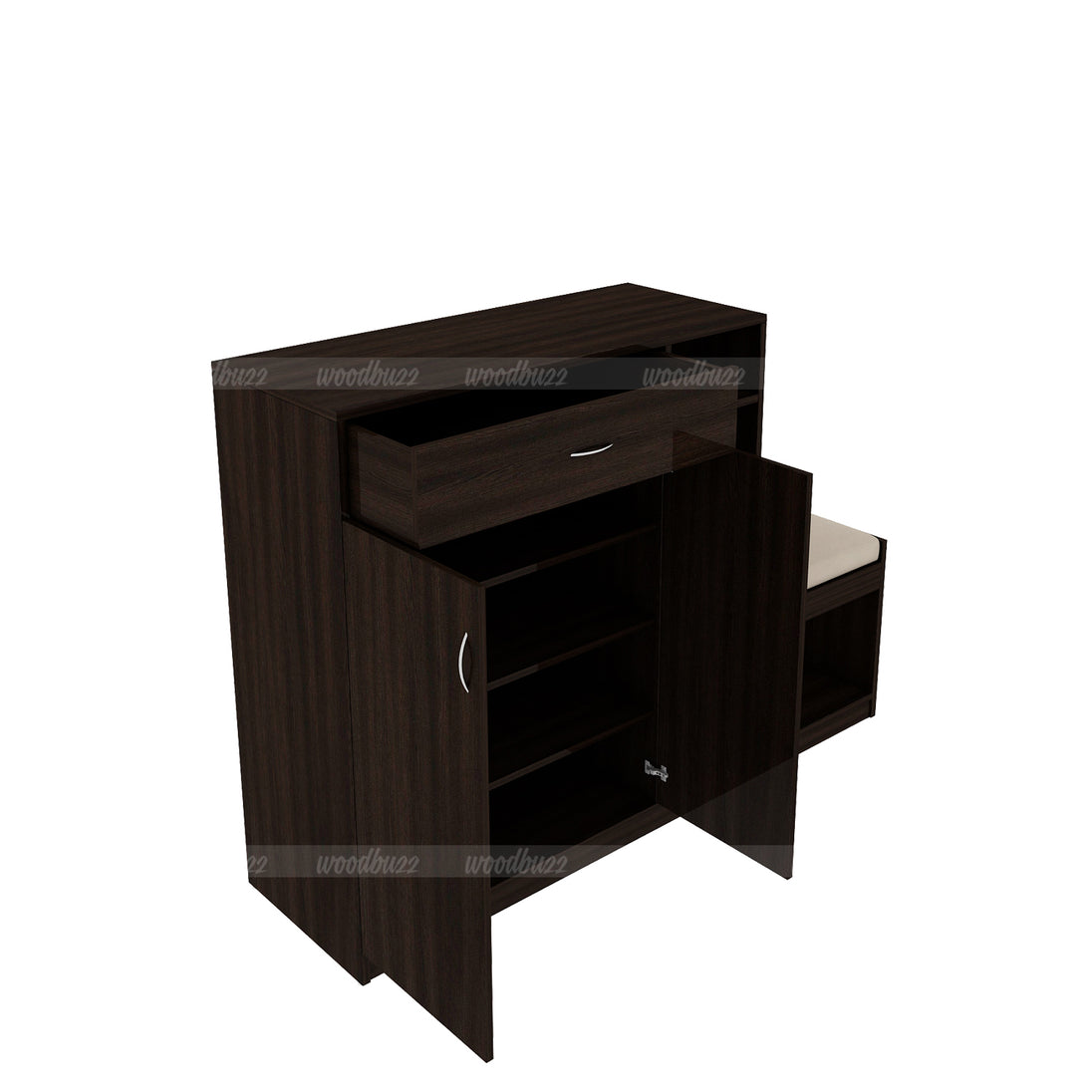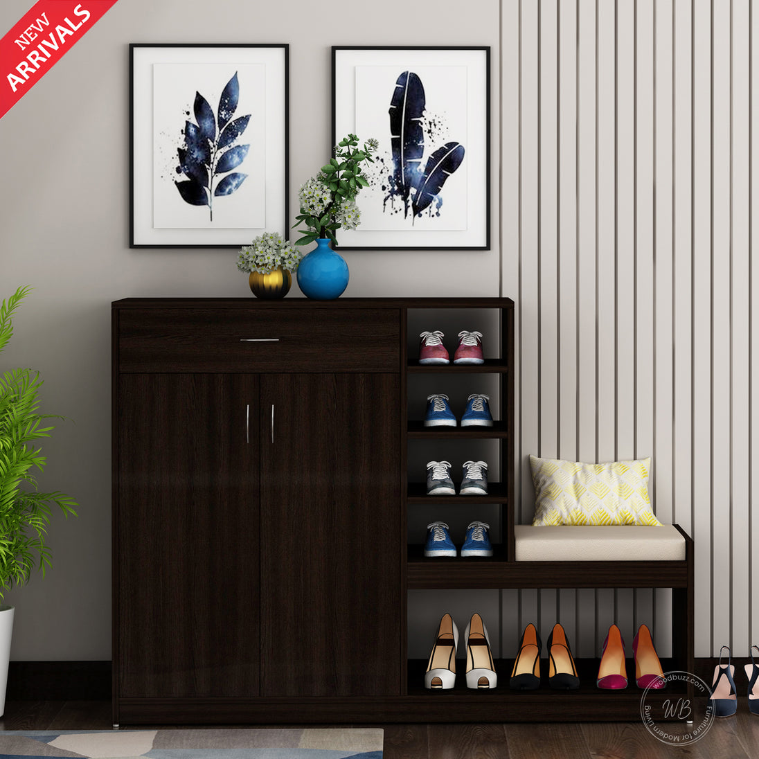 - This storage cabinet has a fabulous door design and enough space to store any type of shoes, sandals, or stilettos. Two door and open shelves shoe cabinet accommodates 10 Sets and one seat to rest your body while wearing and removing your styles.